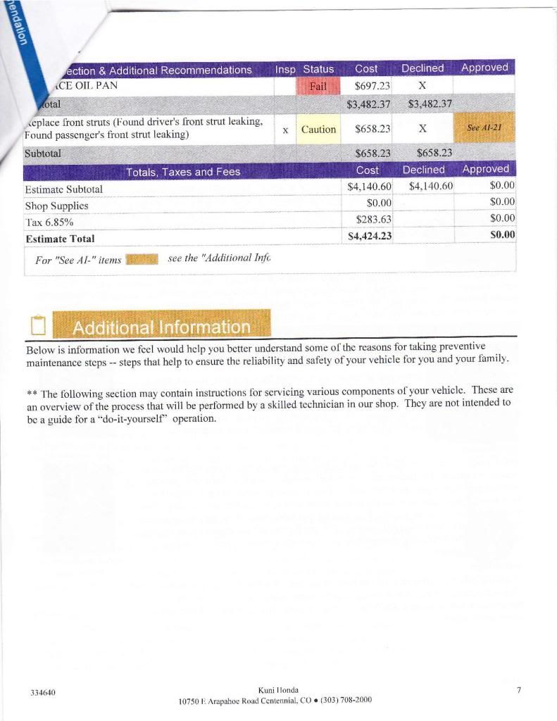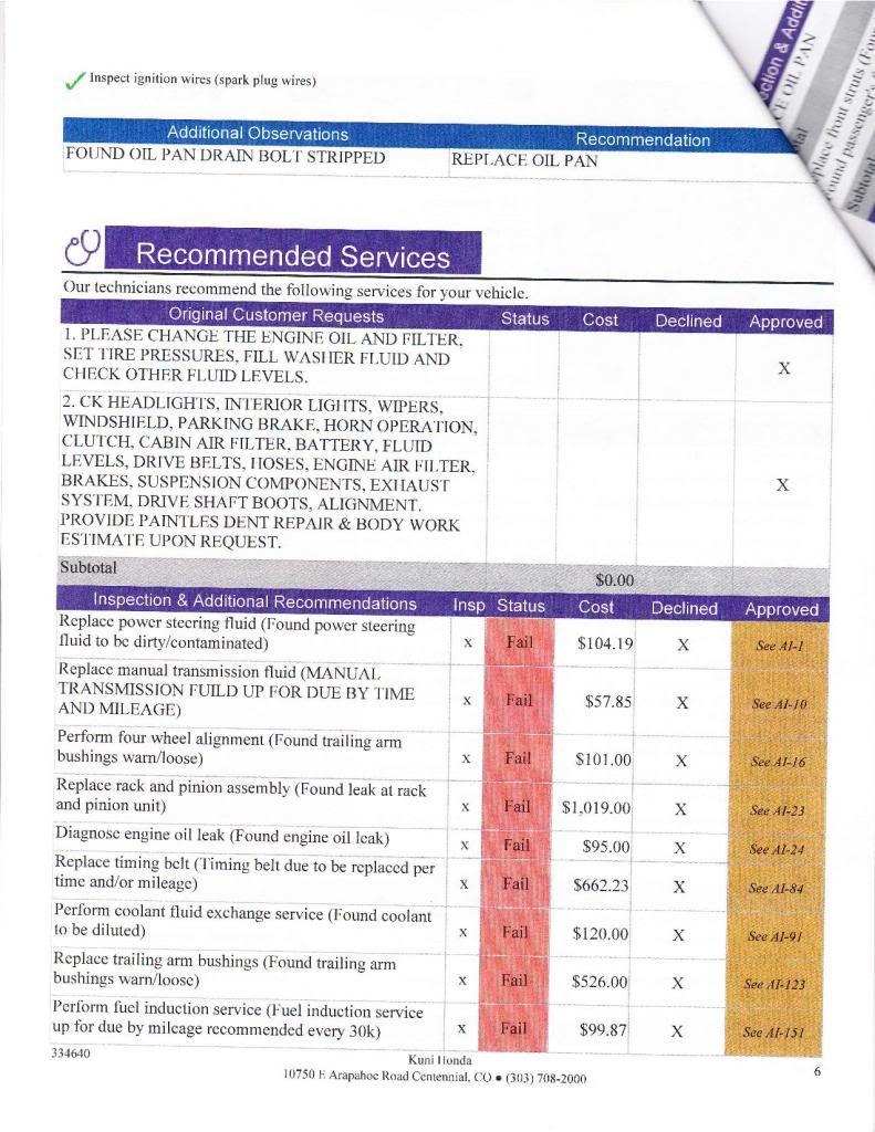 Hello there, I brought my 1998 Honda Civic HX to Kuni Honda on Arapahoe Rd. to have them change the oil yesterday and after about half an hour of waiting, they came out and told me that my oil pan drain plug has been stripped so for now, they put some Hondabond blue for a temporary fix and I'm leaking a bit of oil from my drain plug. Maybe 3-4 drops every 20 min. I drove to Boulder today and I was low about half a quart so I just bought 3 quarts of 5w-30 synthetic to keep it filled. Kuni wants $700 to replace the oil pan and gasket which I think it's very unreasonable. I had Grease Monkey in Boulder on 28th street replace my oil last and I know they were probably the ones who over torqued the drain bolt. They also gave me a list of other things that are wrong with my car which adds up to $4,400 which is absurd!! I have attached the list they gave me. If someone could explain to me what those things should really cost and what shop to go to that uses good quality parts or allow me to give them the part to use to replace, that would be great!! Thank you very much!!