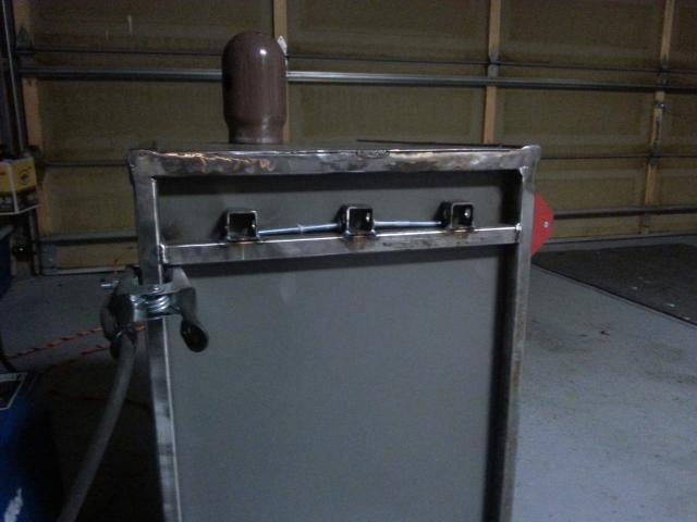 The push handle not yet in place. Thanks to DWDUC's suggestion, I'm going to use a set of mountain bike handlebars as my push handle. They happen to be out of service carbon fiber bars. Will tie in my love for mountain bikes nicely. You can also see I have the top shelf installed. The middle shelf is for storing the welding torch cleanly tucked away. The top shelf is removable facilitating cleaning of the torch storage area. The power strips will be housed on the sides between the upper shelf and top of filing cabinet. In the future, I may add the ability to have the top shelf tilt slightly skyward, but for now, the height of the welder makes adjusting the settings easy while working.