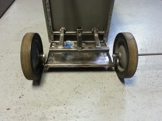 The stainless steel wheel axles welded in place. I cut the axle from stainless all thread. The all thread poked through the hole about 1/4" and I welded it in place on the one side.