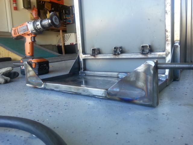 I used 1.5" wide 1/8" steel plate and used the break at work to bend it into 90 degree channel. This was done to eliminate the excess space that webbing on traditional angle iron would have created when affixing it to the file cabinet. 14 gauge steel was used under the cabinet so that the cart would retain shape if/when I remove the cabinet for painting, or in the future if I decide to put a stick welder, tig welder, or plasma device (or something that does all 3) under there instead. The principle function of the cabinet is to hold my helmet, grind shield, gloves, specialized tools/clamps, and consumables.