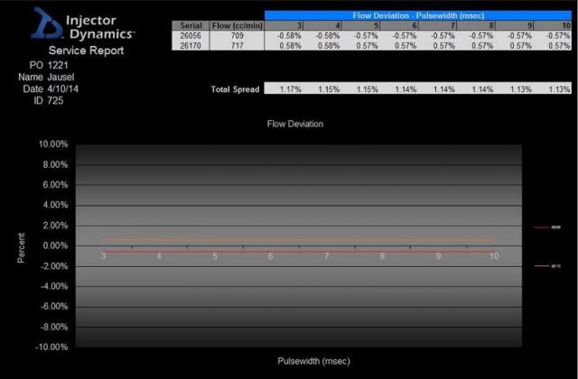 Attached to this email are the flow test results for the ID725s & ID2000s that were sent in to be cleaned and inspected. As you will see, they are still a relatively tight and linear matched set, with average deviation across the entire operating range coming in within our spec of +/- 1.5% .