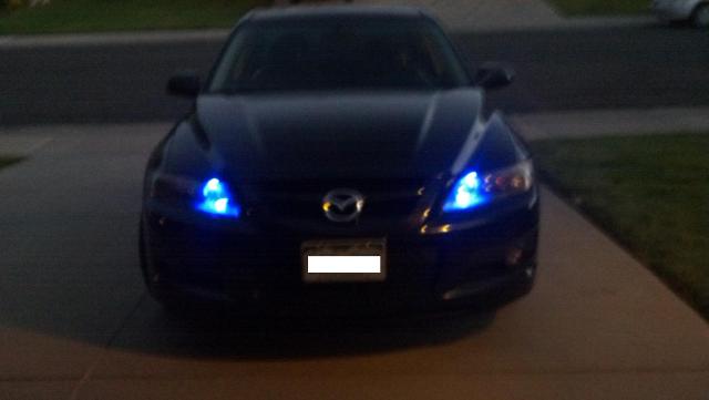 I decided to replace the little parking light bulbs in the headlight housings with blue LEDs, and ended up ordering a pack of 12 size 194 bulbs. Coincidentally that is the same number of 194 sockets in a Mazdaspeed 6... This is how she turned out.