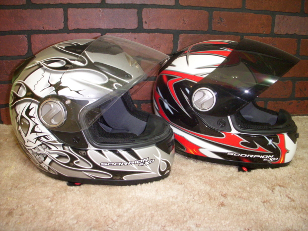 ScorpionExo700 series helmets (2) with 2 clear and 1 tint visor. Designs are Red/black Burst and Silver/Black "Crackhead" - size SM (DOT AND SNELL APPROVED!!! for TRACK RACING!!!)