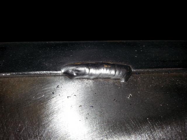 Stitch weld picture. This weld shows a lot of mounding. I am currently welding on a 110v setting. I attribute the excess weld metal to hitting it with too little "heat" and getting the weld too high on the angle iron side. It may be partially due to my slower travel speed as well. The weld is sufficient for its purpose though.