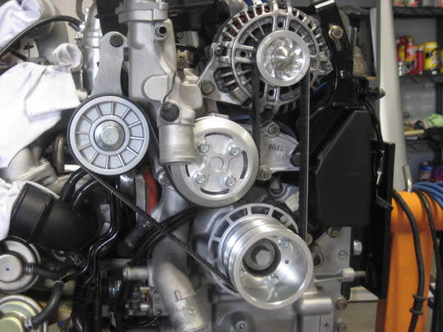 Yeah I'm not sure I understood what you were saying originally. I thought you were saying you had the air pump deletion kit, the pulley that mounts right there so you retain more contact area belt-to-water pump pulley. Or are you saying you just have the underdrive pulleys? I have those already. When you remove the air pump, your belt is ALOT shorter and it barely touches the water pump pulley, that's why I thought you had the deletion kit. I'm with Chris though, I don't think the underdrive pulleys would make much difference. I think the only thing they'd really affect is your alternator not putting out as much juice or something, which is why I'm moving to an alternator that puts out 140amps instead of the stock 90amps or whatever. Let me know if you wanna know more about that.