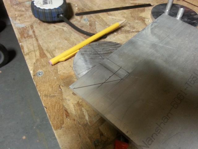 Sketch of original mounting tab thought on aluminum. This idea was eliminated so that more surface area was available for welding it to the tank. The piece was eventually cut out with a jigsaw and then hand filed to final shape. Which can be seen in the previous picture.